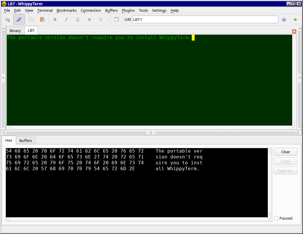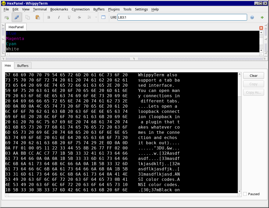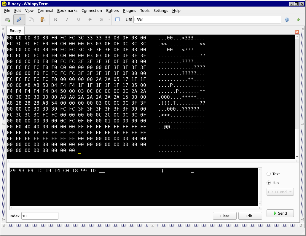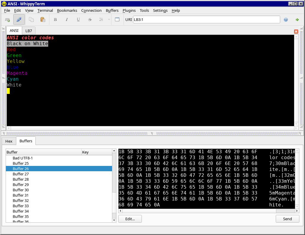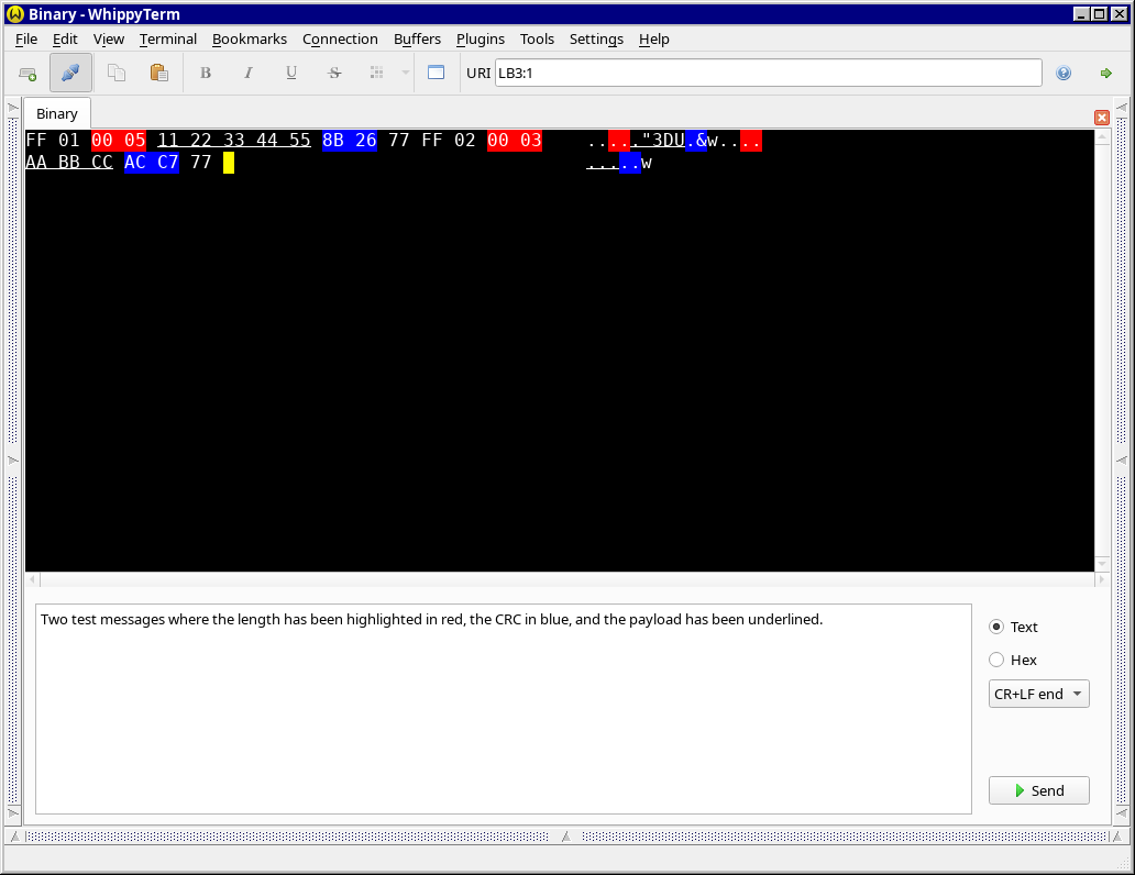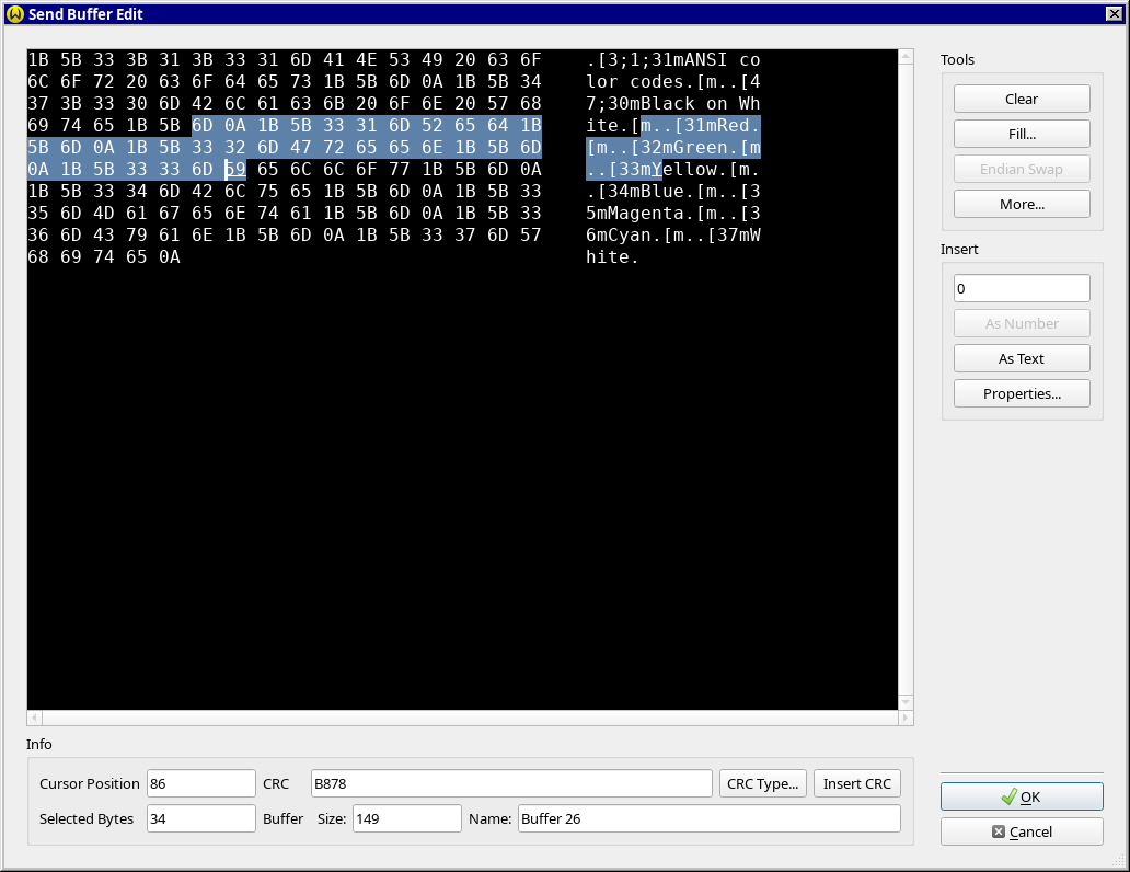 Send buffers let you send blocks of binary data from a buffer. The buffer can be edited and sent by the click of the mouse or press of a key. This lets you build up binary protocols in a quick and easy way.