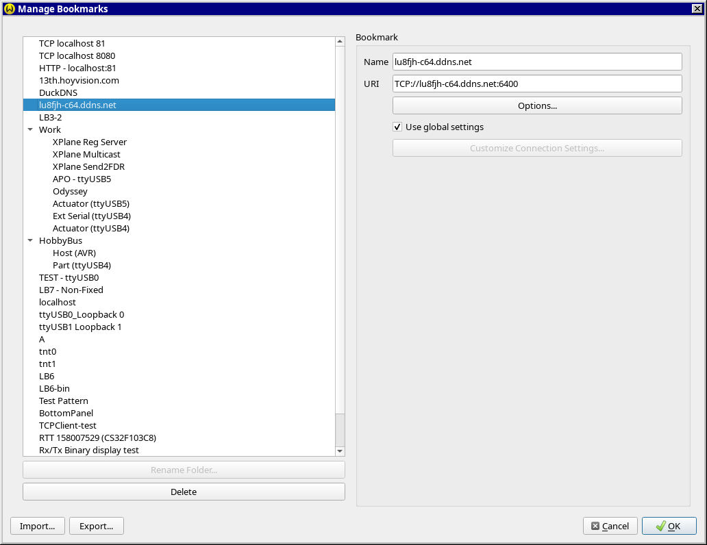 Bookmarks let you setup a connection the way you want and then save them to a menu that can be selected later. You can set things like connection speed, colors, terminal size, text vs binary mode and more.