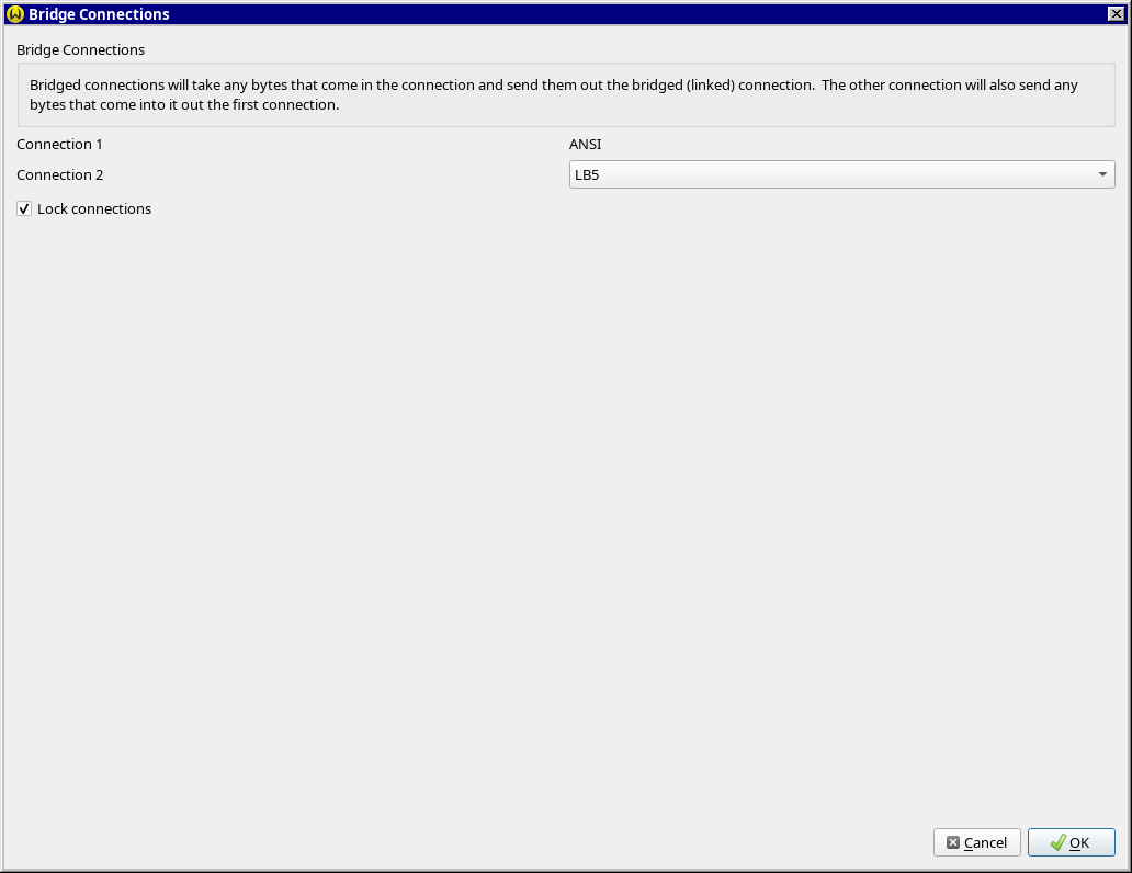 With connection bridging you can connect 2 connections together so that anything that is sent into one connection is sent out the other connection (and vice versa). This allows you to spy on the comuncations between to devices, and/or inject data into the serial stream. You can also connect different connection types together, such as connecting a serial port to a TCP/IP connection.