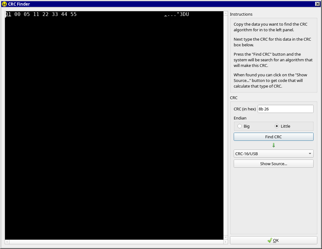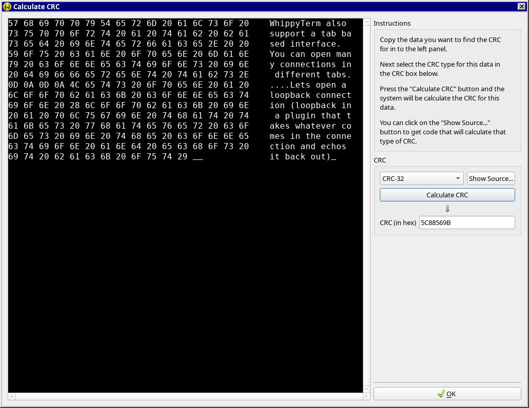 A utility for figuring out what CRC algorithm was used to make a CRC. You select / input the text that is covered by the CRC and then input the CRC that was used in the message. WhippyTerm will then search all of it's known CRC's to see if any matches. If there is a match you can then get source code that calculate that CRC.