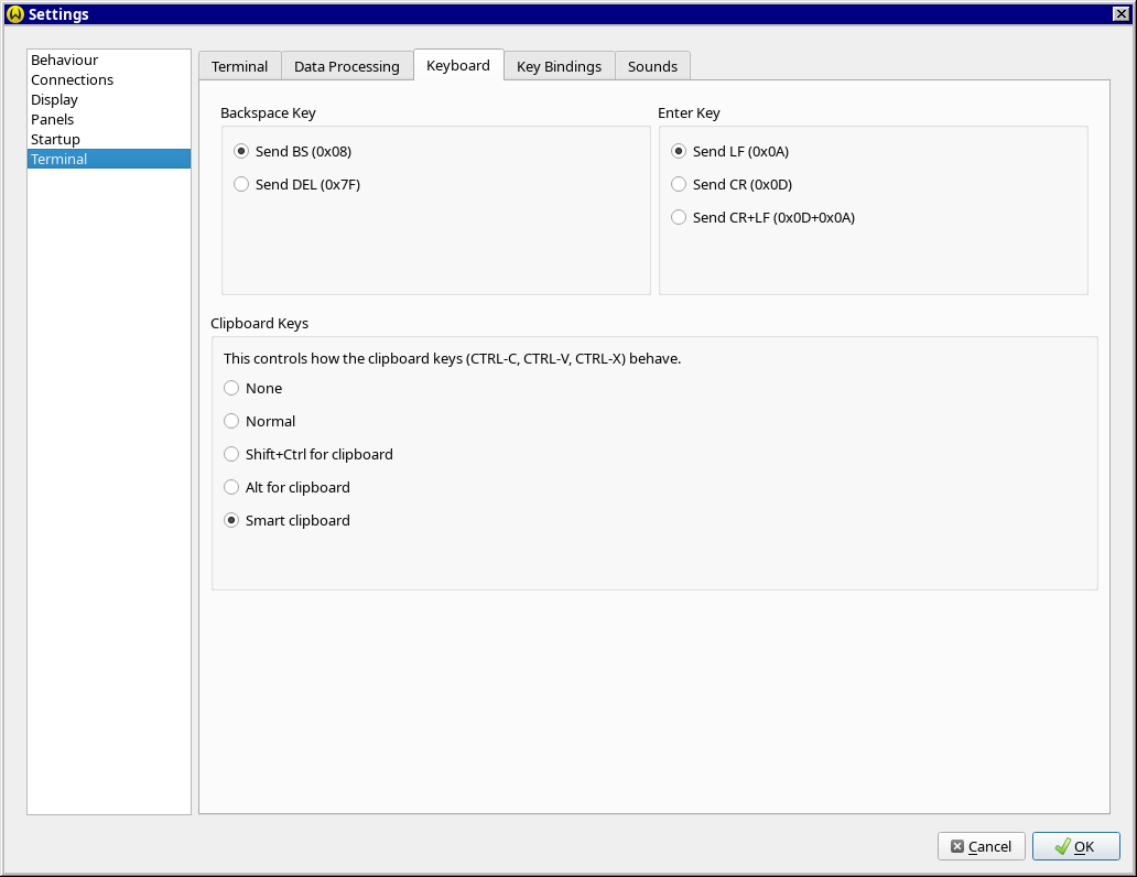 Smart handling of the CTRL-C key press changes what happens when CTRL-C and CTRL-V are pressed making CTRL-C and CTRL-V work as both clipboard controls and break keys in a natural way. When CTRL-C is pressed but there is no selected text then WhippyTerm sends a 0x03 char. If there is a selection then the selection is copied to the clipboard and the selection is cleared. If CTRL-C is pressed a second time (because the selection was cleared) it will send a 0x03. When CTRL-V is pressed 2 times quickly then 0x16 is sent. If CTRL-V is pressed only 1 time or pressed 2 times slowly then the clipboard is sent.