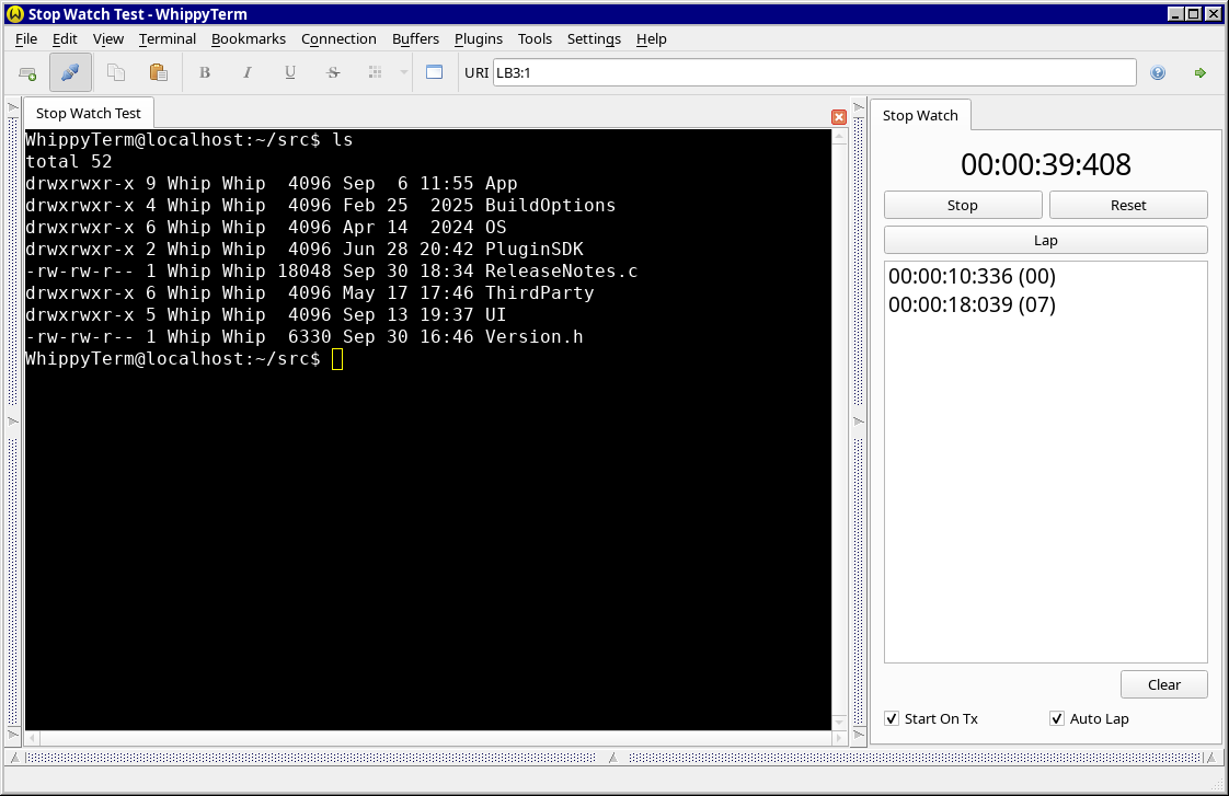 A built in stop watch that can setup to trigger on the first char send. The stop watch can also add a lap (the current time) when there is a pause in the incoming byte stream.